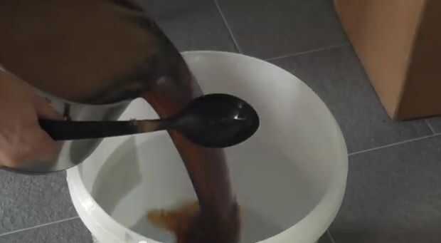 4. Añadir el contenido disuelto de lo kit de cerveza en el cubo de fermentación que se llena con agua fría (cantidad depende del kit de cerveza usas)