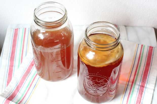 Lugar scoby suavemente en el nuevo té dulce. Cubrir el recipiente con un filtro de café y asegúrelo con una goma. Coloca el frasco en un lugar cálido y oscuro.