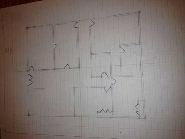 El siguiente paso es determinar la ubicación de las puertas a los dos entrar en la casa, las habitaciones dentro de la casa, y todos los armarios utilizando líneas de luz. Dimensiones de la puerta estándar son 2 pies 8 pulgadas, como se utiliza en el ejemplo. Colocación en la pared se dimensiona desde el centro de la puerta, así que asegúrese de medir en consecuencia.