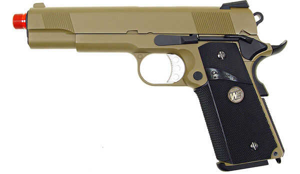 En airsoft, lo que ofrece una buena ventaja es un arma. Ya es una pistola de retroceso de gas $ 300 o un springer 2 dólares. Es bueno en caso de que su arma principal se apaga o te quedas sin munición. Es una marca de pistola de gas bueno, barato. KWA y TSD son armas más costosos y de mayor calidad. Tengo una pistola m1911 WE (arriba). Es relitivley barato ($70), viene con dos revistas y dispara unos 300 fps. Es una buena arma, metal completo y brotes para una pistola.