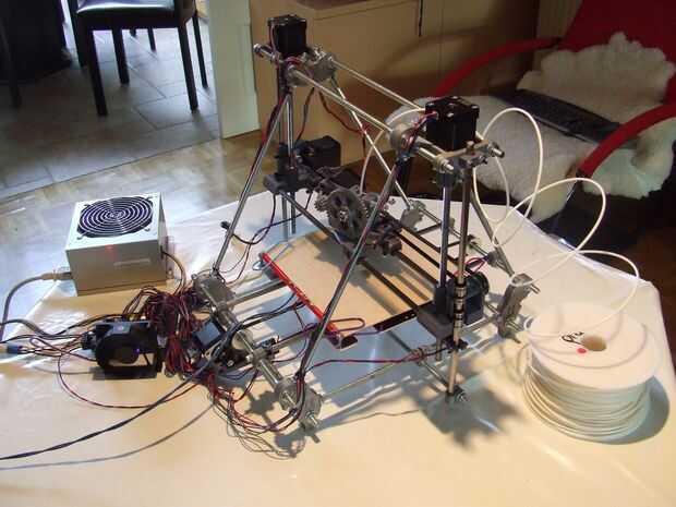 • La primera adición a que va prestando atención es el soporte de la bobina de filamento. Si tu bobina de filamento sólo está sentando al lado de la impresora, el filamento puede no desenrollar, así se torcerá y forma espiral, como puede verse en la primera foto. Cuando procede de impresión, la cantidad de giro aumentará y con ella la tensión interna en el filamento. Estas espirales podrían obstaculizar los ejes de la impresora y bloquear durante la impresión, lo que significa que usted tendrá que imprimir el objeto todo otra vez. También podría aumentar la tensión interna hasta las roturas del filamento, que podrían hacer que la impresora tiene ninguÌ n filamento estando a mitad de camino una impresión. Razón suficiente para imprimir un soporte de bobina de filamento.