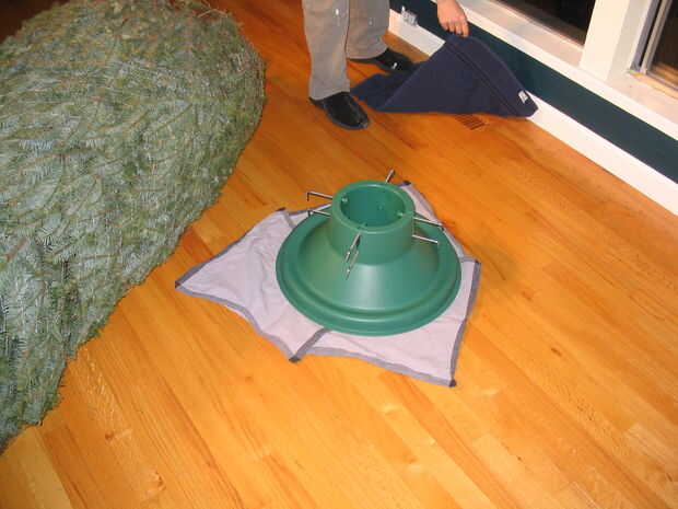 Coloque el soporte del árbol en algunas toallas para evitar rayar el piso con plástico por debajo de las toallas para recoger derrames. Cubrir cualquier respiraderos (toallas más!) para atrapar agujas que caen. No llene el soporte con agua hasta que el árbol está completamente configurado.
