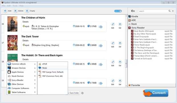 Haga clic en "Formato de salida" lista desplegable para seleccionar el formato de salida. ePubor software de eliminación de DRM de Kindle eBooks soporta conversión DRM Kindle ebooks a comunes formatos de ebook, incluyendo ePub, PDF, Mobi y casi todos los ereaders, como Apple iPad, Nook, KoBo, Sony eReaders etc.. Usted puede elegir el mejor formato adecuado que necesita como salida.