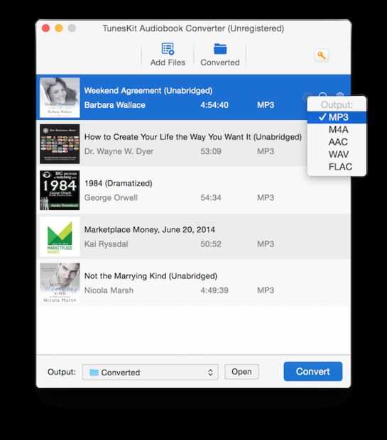 Haz clic en el icono de "engranaje" junto al nombre del audiolibro, entonces usted puede elegir diferentes formatos de audio para la conversión de audiolibro. TunesKit soporta MP3, AAC, M4A, WMA, WAV, FLAC formatos como salida. MP3 es el formato más popular por los clientes.