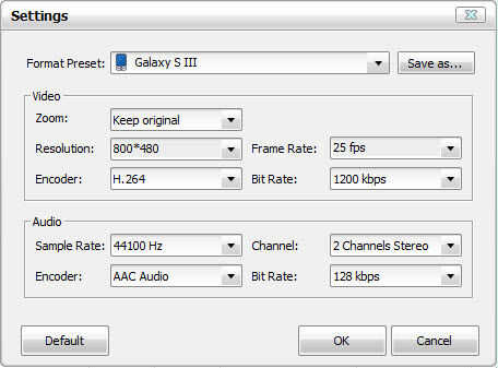 Haga clic en el icono a la derecha de la ficha vídeo, puede ajustar los parámetros de la configuración de vídeo y audio. Puede cambiar el códec de vídeo, tamaño de vídeo, bitrate de vídeo y otros parámetros por sí mismo.