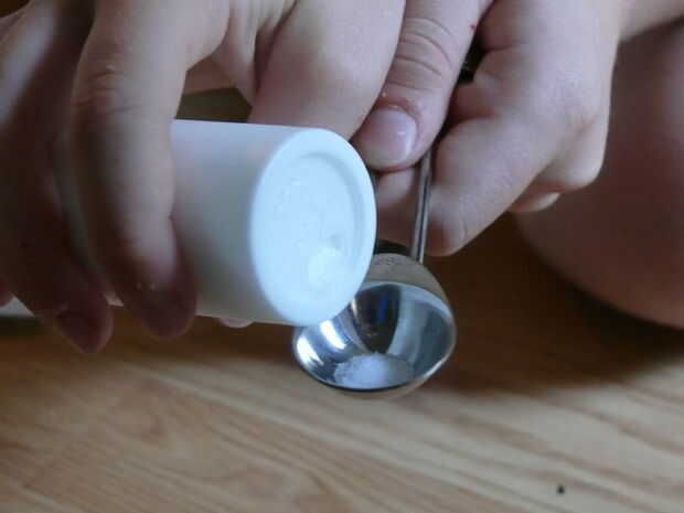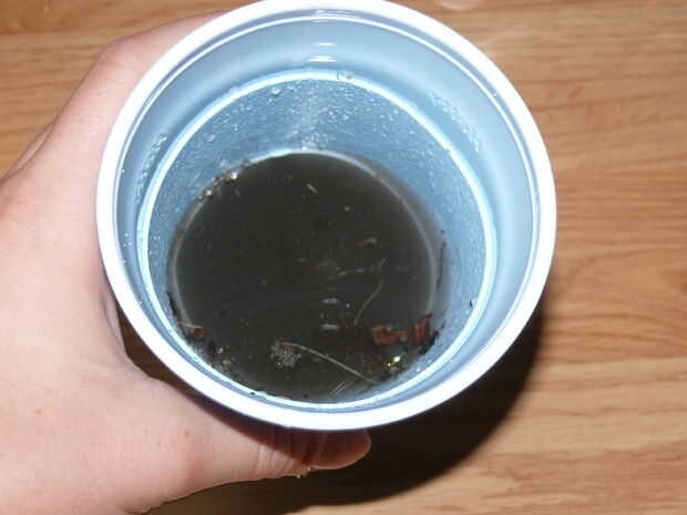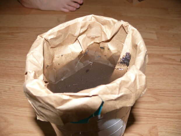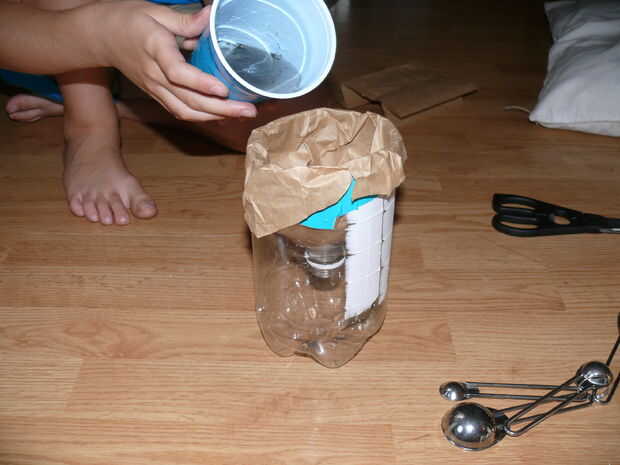 Hágale un agujero minúsculo pequeñito en la bolsa de papel. Vierta 2 cucharadas de sal en la bolsa. Verter un vaso de agua mezclado con polvo en la bolsa. El agua comienza a gotear en la forma de botella más limpia de lo que era cuando se vierte.