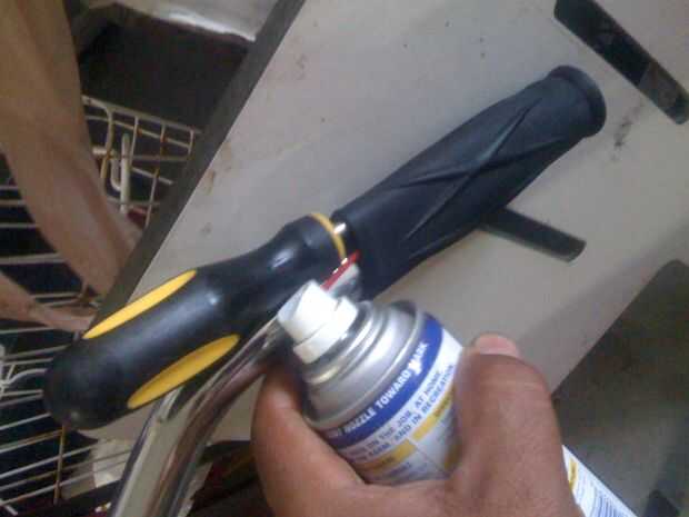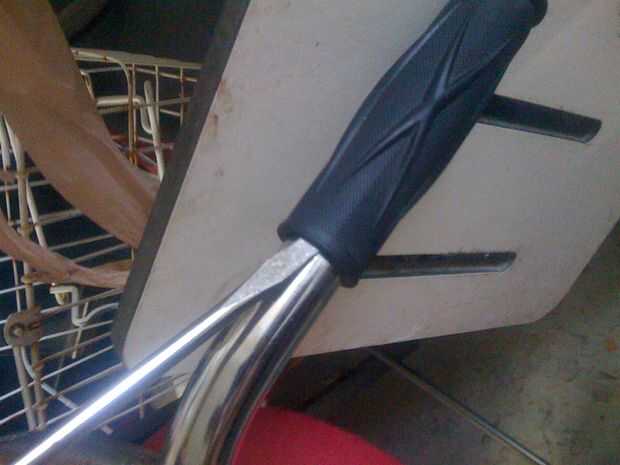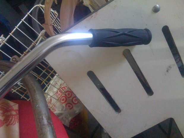 un soporte de cámara para bicicleta que pasa por debajo del manillar.Hecho de Monte luz de cola, un trípode pequeño y barato, ángulo el 90 por ciento para la construcción de una silla.Permite grabar un vídeo de sus paseos sin interferir con las palan