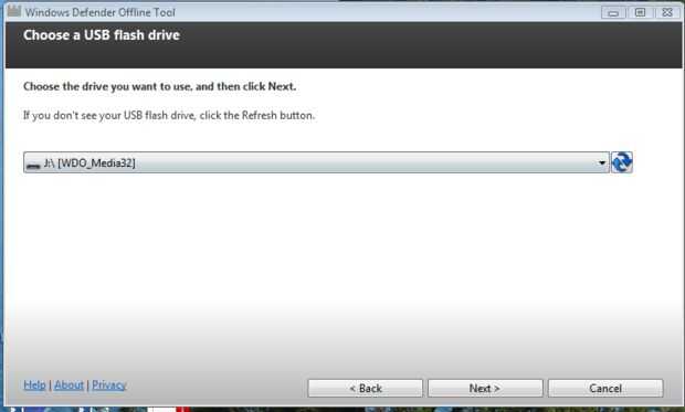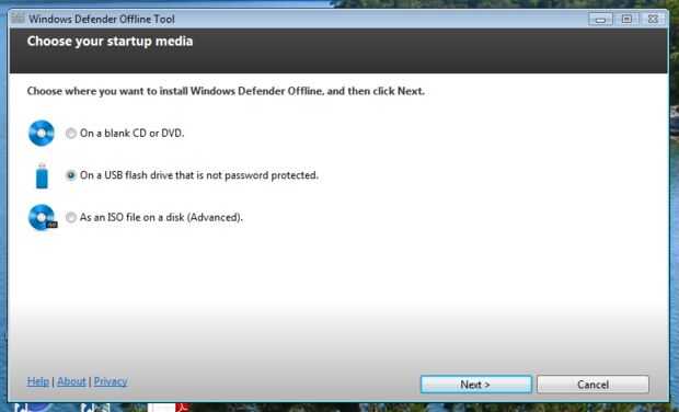 6. Windows Defender Offline le llevará a través de varios mensajes. Esto incluye la selección del tipo de dispositivo que esté utilizando el pendrive o CD-ROM para instalar Windows Defender Offline en. Esto será el dispositivo que arranque su computadora y ejecute el software de Windows Defender Offline.