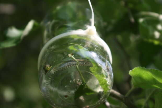 Llevar su botella de vidrio y colóquelo sobre la rama de la fruta de florecimiento. No desea que el fruto que crece en el cuello de la botella, así que coloque la rama más abajo en la botella. Tratar de conseguir una mayoría de la rama dentro de la botella. Encontrar la sucursal apoyo para que pueda utilizar esa rama como apoyo con el lazo del cierre relámpago o cadena.
