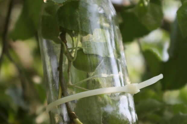 Encontrar algunos lazos zip de un carrete de cuerda. Asegure la botella de vidrio a una rama que está cerca. Asegúrese de no herir a la otra rama. Trate de no cubrir la botella, forma que la rama dentro de la botella puede recibir a algún tipo de flujo de aire.