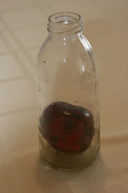 Una vez terminado su fruta crece, retire con cuidado la rama de la botella. Puede agitar la botella, agita la rama, lo que puede hacer para eliminar la rama y mantener la fruta dentro de la botella. Podría tirar de la rama y luego cortar. Mi manzana cayó justo al lado.