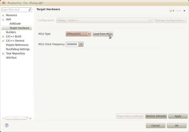 Ahora haga clic en cargadeMCU. Si todo ha funcionado el dispositivo aparecen en el cuadro debe cambiar al dispositivo que está actualmente en el programador. Si trabajó haga clic en aplicar y luego haga clic en Aceptar. Si no funciona, seleccione el MCU de la lista (puede ser que el programador no es compatible con la característica de Carga de MCU ) haga clic en aplicar y haga clic en Aceptar.