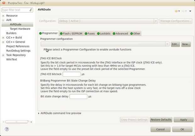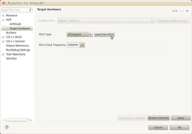Ahora vamos a ver si han trabajado nuestros ajustes - intentaremos conseguir el MCU para decirnos lo que es. Haga clic en el elemento de lista deHardware de destinoa la izquierda de la pantalla. Asegúrese de que el programador;