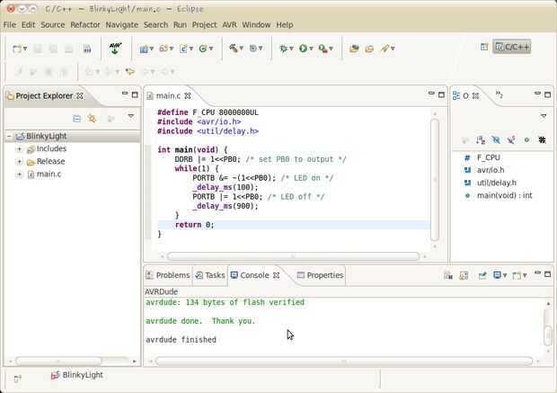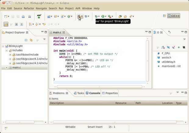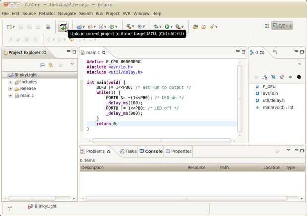 Haga clic en proyecto > construir todo para la construcción de su proyecto. Después de fijar cualquier compilación errores haga clic en AVR > Proyecto subir al dispositivo de destino. La pestaña consola ahora debe llenar con texto verde que describe el proceso que está teniendo lugar. Si el proceso de carga no se compruebe que el dispositivo es definitivamente encendido y enchufado. Si está cargando a un Arduino, presione el botón de reset justo antes de subir.