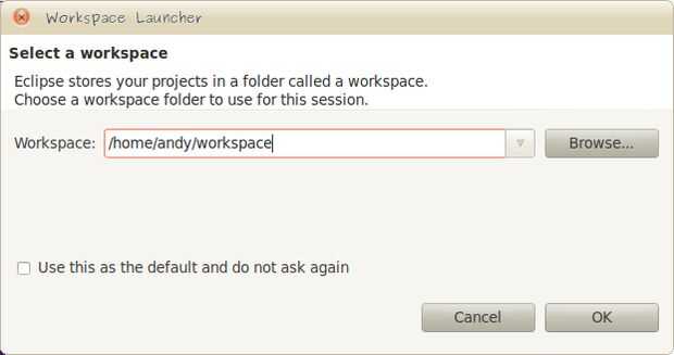 La pantalla de arranque le preguntará donde se encuentra un espacio de trabajo. Si usted no sabe lo que se trata de dejar esto y pulse OK. Para los programadores más experimentados, una palabra a los sabios; Copia de seguridad de su puesto de trabajo ya sea con la versión de control o incluso simplemente una copia local y evitar el uso de un espacio de trabajo existente.