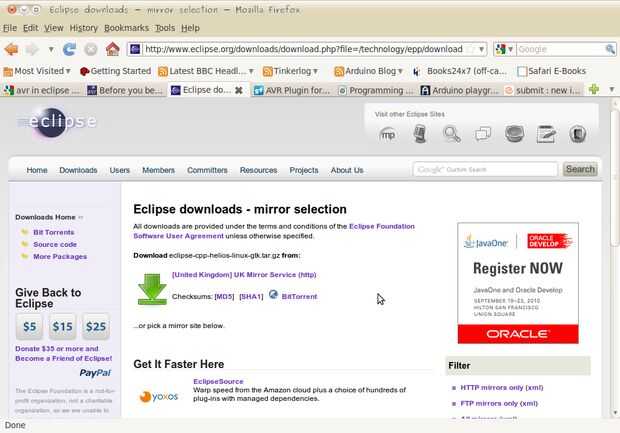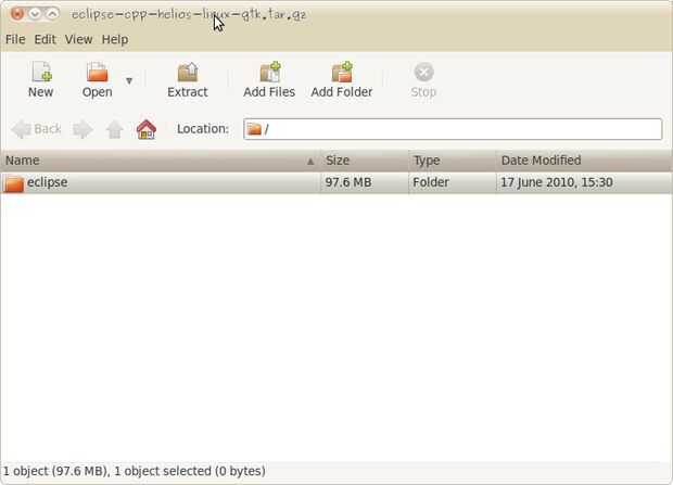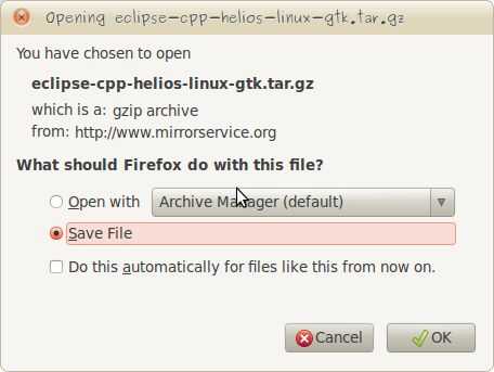 Cerca de la parte superior de la descarga de página debe ser la lectura de algún texto "descargar eclipse-cpp-helios-linux-gtk.tar.gz de:" seguida de un enlace titulado ... Servicio de espejo... (http) o similar. Haga clic en el enlace y la descarga debería comenzar. Se abstengan de publicar un enlace porque el Eclipse se actualiza con bastante regularidad, por lo que necesitará revisar esta página para obtener la última versión.