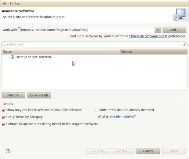 Para instalar el AVR plugin ir al menú superior en Eclipse, seleccione Ayuda > instalar Software nuevo. Se abrirá una nueva ventana titulada instalación. Cerca de la cima es un desplegable de la caja con "trabajo con:" es la izquierda. Haga clic en la casilla y escriba http://avr-eclipse.sourceforge.net/updatesite/ y haga clic en Agregar. En el pop-up box que aparece tipo AVR Eclipse Plugin en el cuadro "nombre".