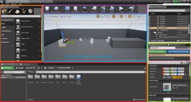 Estudio de la imagen de arriba para familiarizarse con las partes más importantes del Editor motor de Unreal. Como alternativa, vea el video de YouTube.