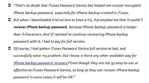 Ahora recibí un e-mail de un usuario de iPhone, que dijo que ha usado iTunes Genius contraseña encontrar contraseña copia de seguridad de cifrado de la iPhone. Pero tiene algunos puntos de vista después de usar, lo que sigue es su revisión.