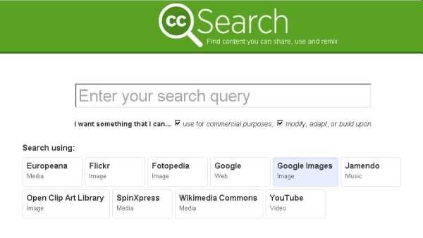 El primer paso es apuntar su navegador a http://search.creativecommons.org. No se trata de un motor de búsqueda, pero es un sitio muy conveniente que permite el acceso a servicios de búsqueda que puede encontrar el contenido que usted puede compartir, usar y remix.