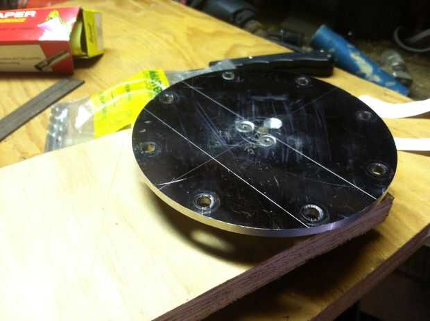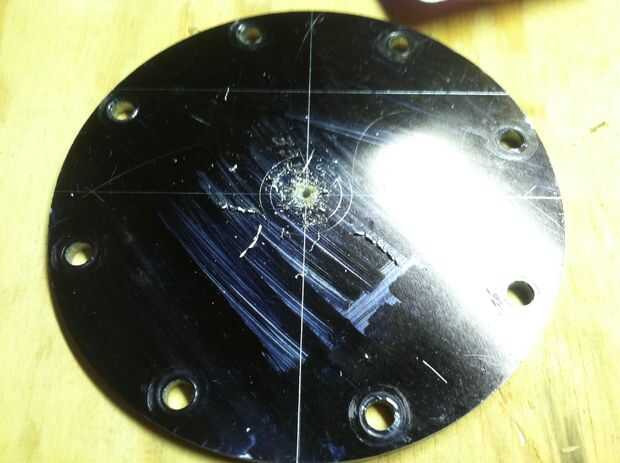 En este caso, tenía un orificio de 1/4" en el centro, y 3 equidistantes orificios para los tornillos sobre el centro. (He perdido uno de los tornillos en la foto)