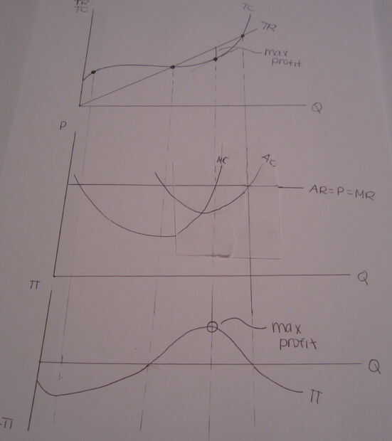 Beneficio cuando está maximizado y minimizado el MC = When MR. TC = TR AC = MR. como dijimos anteriormente cuando el total de los ingresos es mayor que el costo total tenemos ganancia positiva y cuando la TC es mayor que el TR el beneficio es negativo. De esto podemos combinar el TR, curva del TC con el MC, AC y los gráficos de ganancias hasta encontrar el punto en el cual la empresa maximiza beneficios.