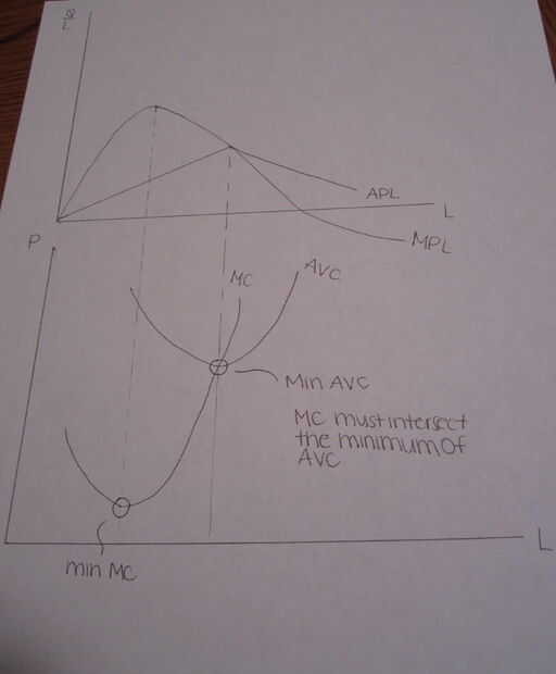 A medida que el producto marginal del trabajo aumenta la MC disminuye y cuando el producto marginal del trabajo disminuye el incremento de la MC. Se trata de cómo derivamos la curva MC y AVC. La curva AC estará por encima de la curva de AVC y el MC intersectará al mínimo de la curva de AVC y AC.