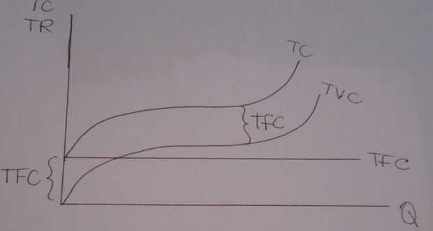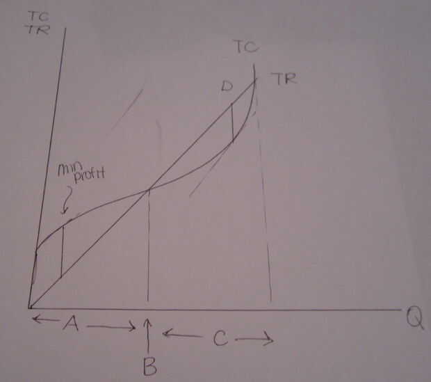 La curva del TC desde arriba se incorpora en el siguiente gráfico. El TC y TR se combinan. TR es P * Q, que es una relación lineal y aumentos de precio y aumento de la cantidad.