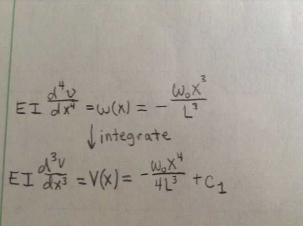 En este paso se integrará la primera ecuación para obtener la segunda ecuación (que es en la parte inferior de la primera foto). Al integrar por primera vez tendrá una ecuación para el esfuerzo cortante es una función de x. Sin embargo, al integrar una constante de integración aparecerá. Este es un valor desconocido que prohíbe utilizar la ecuación. Para deshacerse de lo desconocido constante integración que tienes enchufe en las condiciones de límite que fueron establecidos anterior (V(0)=0).