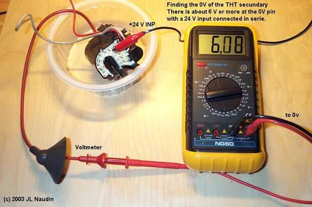 una) necesita una fuente de alimentación 24 V DC y un voltímetro digital en el rango de 20 V. Conectar el + entrada de su voltímetro para el enchufe de salida THT (en la taza de la succión) y el (-) a 0V de la fuente de alimentación. Entonces, con el + 24V salida de tu fuente de alimentación, prueba cada pin de su transformador flyback. Cuando se mide un voltaje entre 5 y 10 V han encontrado el pin V 0 de su bobina secundaria. Esto es muy simple... Mira el esquema y la foto de abajo:
