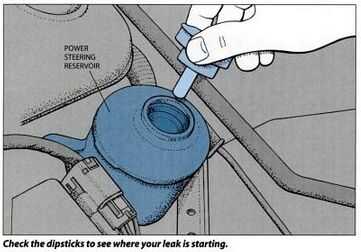 El depósito del manejo de la energía es un buen lugar para empezar si el aceite parece rojizo. Si se completa el depósito, y la fuga es en la parte delantera, compruebe las líneas de transmisión automática refrigerador, particularmente si tienen secciones de manguera de goma con abrazaderas. Si el aceite es definitivamente negro y las gotas directamente debajo del motor, es aceite de motor, que es la fuga más comun. ¿Pero, una vez más, estamos ante esa misma pregunta: dónde proviene? Una fuga lenta sigue las costillas en el bloque del motor, se ha quemado a lo largo de la parte superior de las juntas de la Junta y aceite llega a estar en todas partes.