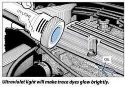 Que tenga que realizar un tratamiento similar más cercano a la parte superior del motor para realmente identificar algunas pérdidas, sobre todo los de empaques del múltiple de admisión. Sin embargo, si el flujo de aceite es soplado a través de un camino complejo a lo largo del motor antes de que una gota caiga al suelo, usando un tinte de rastro y la luz ultravioleta es una forma más segura.