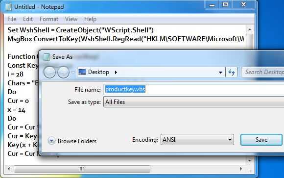 Haga clic en archivo -> Guardar como. Cambie el guardar como tipo a Todos los archivos y el nombre algo termina con la extensión vbs , por ejemplo, productkey.vbs. Haga clic en el botón Guardar para guardar el archivo.