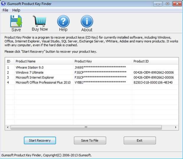 Lo que tienes que hacer es descargar e instalar iSumsoft Product Key Finder en tu ordenador, ejecutarlo y haz clic en el botón Start Recovery . Entonces todas las claves de producto e ID para Windows y otro software instalado en el equipo debe demostró en la lista. Clic en el botón Guardar en archivo puede guardar todas las claves de producto en un bloc de notas.