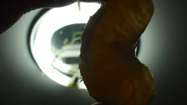 Cómo hacerlo, mantenga el segmento hasta la luz y mirar a través de él, si el segmento de muestra sin decoloración entonces hay no hay semillas, si hay una mancha oscura o dos o tres, entonces hay una semilla - o dos o tres...