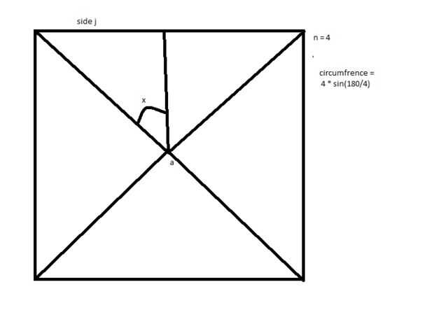 Si establecemos el número de lados n y el diámetro de la forma es 1, entonces esto significa que la fórmula total de la circunferencia de la forma n * sin(180/n). eso significa que la circunferencia de la Plaza es de 2.83