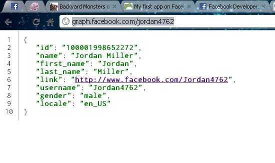 Ahora que tiene su nombre de usuario, usted puede encontrar su ID! Dirígete a http://graph.facebook.com/USERNAME y usted debería ver algo como la imagen. Mina puede Compruebe http://graph.facebook.com/jordan4762