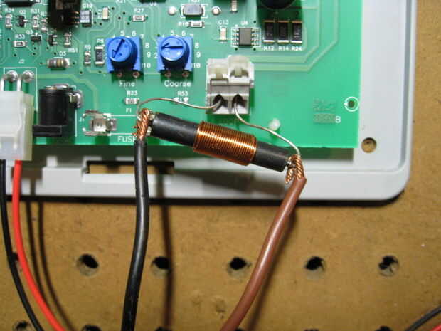 Tomar los dos cables que desconectó del transmisor y conecte a los cables de RF choke. Luego inserte los cables de la estrangulación en los conectores del transmisor donde originalmente estaban conectados los cables. Según tengo entendido, esto permite que el transmisor continuará enviando una señal a la guía, aunque está roto.