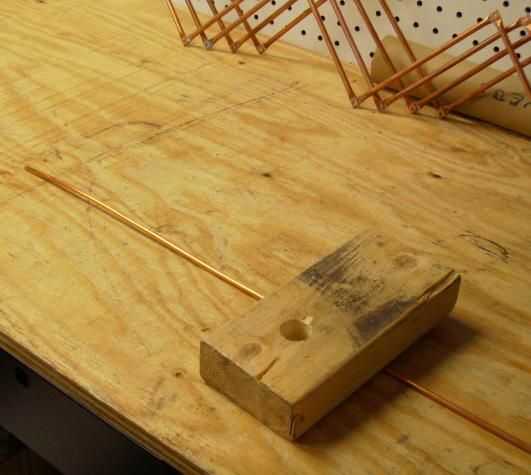 Agudo corta curvas pueden ser ligeramente golpeado ligeramente hacia fuera contra la mesa con un martillo, el cobre será fácil producción. El cable debe ser rodado durante golpear ligeramente. Grandes curvas severas pueden enderezarse por chasquido abajo del cable con el borde de un bloque de madera o golpea el bloque con el martillo. No quiere aplanar el cable. Una vez estan alisadas las curvas graves, sujetar un extremo del cable para el benchtop y frote el bloque, aplicando presión hacia abajo, desde el centro del alambre en el extremo suelto. El alambre se convertirá rápidamente en caliente, por lo que es necesario que retire la pinza y el alambre con frecuencia, si no que se encrespan del rodillo. Sujete el otro extremo y repetir el proceso. Tardará unos minutos, pero el alambre se convertirá en recto. El bloque podría funcionar mejor si tenía una ranura poco profunda de V en la parte inferior para ejecutar a lo largo del alambre, pero el bloque llano funciona tan bien que no me he molestado para tratar de.