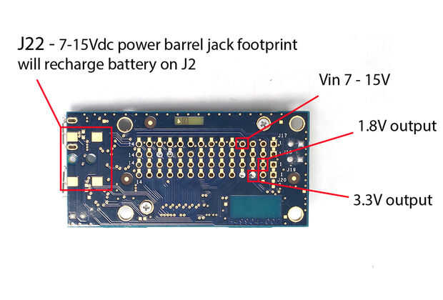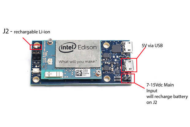Hay una entrada de alimentación principal que puede tomar 7 - 15Vdc y una huella de un cañón de 2,5 mm enchufede soldadura. Estas dos fuentes de alimentación para el circuito de carga que se carga los iones de litio en un 4.2V tipo. El sistema de Edison funciona entre 3.15V - 4.5V, sensores de funcionamiento análogos, el voltaje de referencia alto será 4.5V, ser consciente de ello durante la calibración.