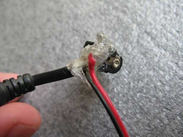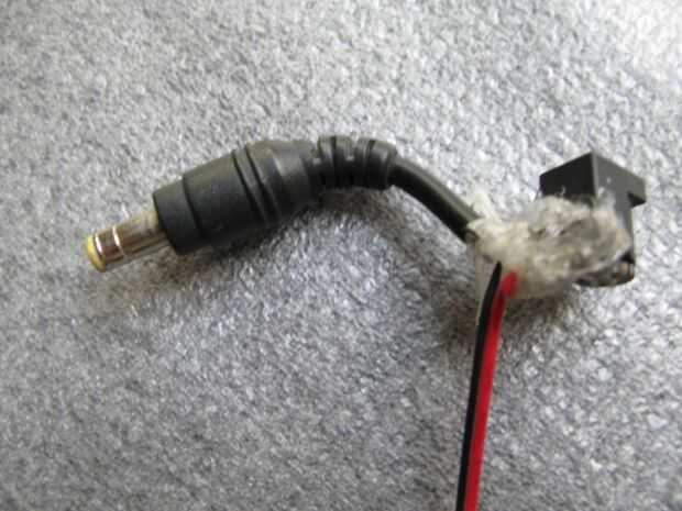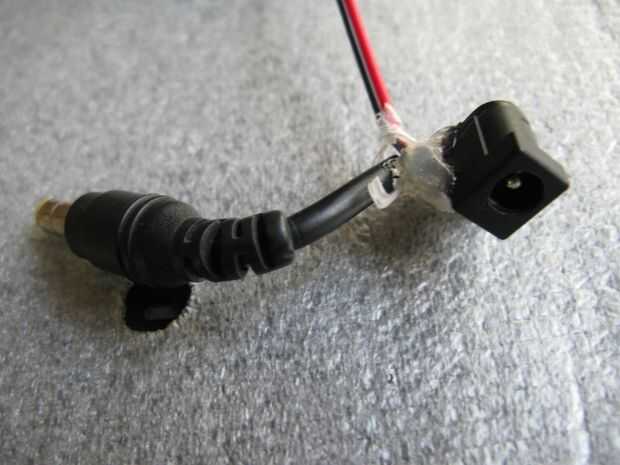 En mi caso el enchufe masculino tiene dos alambres dentro de otras. (+) Cable está en el centro (alambre interior) y el (-) (hilo exterior) es alrededor de (+) cable. Separar los dos cables y conectarlos a la patilla derecha