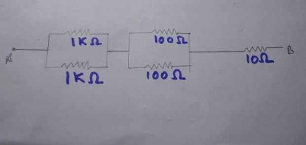 1K y 1K en paralelo significa 500 ohmios. A continuación, 100 ohm y 100 ohm en paralelo significa 50 ohmios. Total es resistencia de 550 ohm + 10 ohm. Tenemos 560 ohmios en total. Y apuesto a que la mayoría de ustedes prefieren comprarlos en su lugar después de leer esto!!