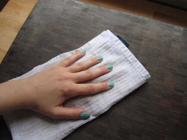 Limpie la superficie de la tabla de cortar, frotando suavemente para obtener el aceite por todas partes. Usted continuará a añadir más aceite y frote hasta que toda la superficie del tablero es brillante y se llevará en ningún aceite extra. Asegúrese de obtener los lados de la tabla de cortar así!