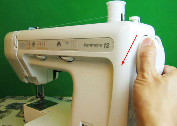 -Coge la rueda de la derecha de la máquina de coser y girar hacia usted