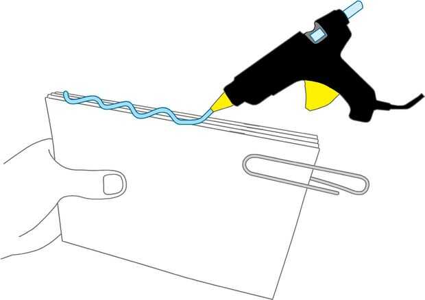 Cuando están alineados todos muy bien aplicar pegamento a sólo las espinas de los folios. Se puede usar pegamento blanco para esto (esto fue lo que pegamento blanco fue hecho originalmente para BTW) pero debes tener cuidado de no dejarlo gotear en a las brechas entre los folios (tal vez pintar la tela sería mejor.) Alternativamente puede utilizar caliente para esta parte. Otra vez, caliente del derretimiento se utiliza en industria para el libro obligatorio, por lo que es perfecto para el trabajo.