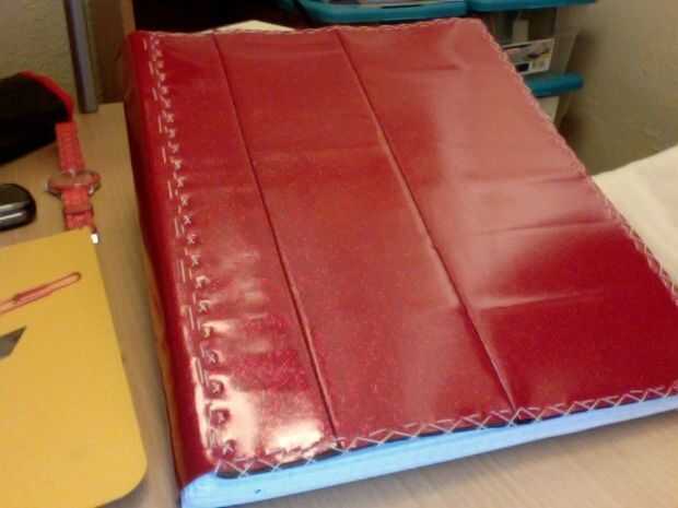 Para la notebook, he añadido una bisagra para el bloque de texto como cosí. Esto fue tan simple como añadir una puntada de silla de montar para sujetar el paño después de látigo de costura de las firmas de la primeras y la últimas. He cosido material adicional a esta bisagra y cosido el material para cubiertas de plástico rescatados de un bloc de notas diferentes. Se trata de un enlace no-adhesiva, que prefiero enormemente sobre el uso de pegamento.