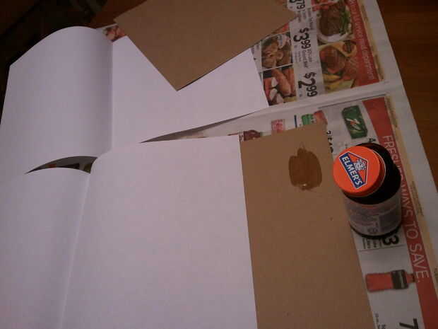 Mientras que la espina dorsal se está secando, es el momento trabajar más en las cubiertas. Utilizar dos hojas de papel que son dos veces el tamaño del libro, (8.5x11 de papel, hojas de uso 11 x 17). Doblar cada uno por la mitad para igualar el tamaño del libro. Aplique cemento de goma a las tapas de cartón por todo lado. Cuidadosamente coloque las hojas a la cartulina con la columna vertebral colgándose y los cantos abiertos alineados con los bordes de la cubierta. Presione la hoja y la cubierta para obtener la mejor adherencia.