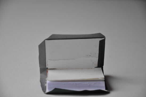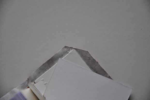 Luego, corte las esquinas de la hoja de embalaje pero ten cuidado! No corte de demasiado porque se ve muy mal! En su lugar utilice un pedazo de cartón del mismo grueso como sus tapas y marque una línea con ese pedazo de cartón un grueso de la esquina de la cubierta. Luego corte las esquinas.