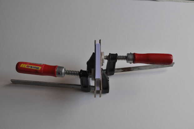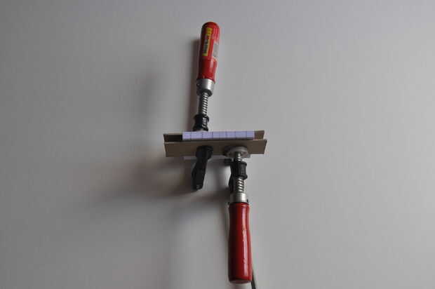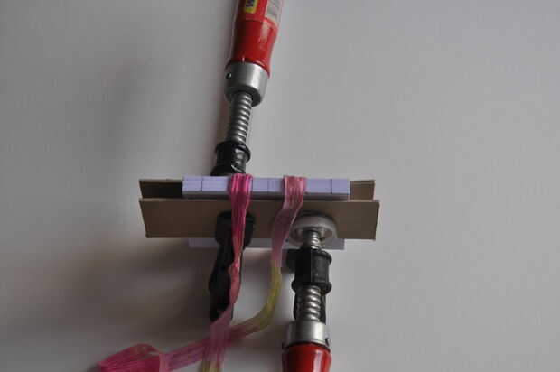 Ahora fije las secciones entre 2 tablas (utilicé cartulina muy fuerte). Dibujar con un lápiz y una regla una línea de alrededor de 0,5 a 1 cm de los bordes según el tamaño de tu libro. (Lo hice 8 mm) Ubique el centro y coloque sus cintas sobre a medio camino entre el centro y la primera línea que trazaste.