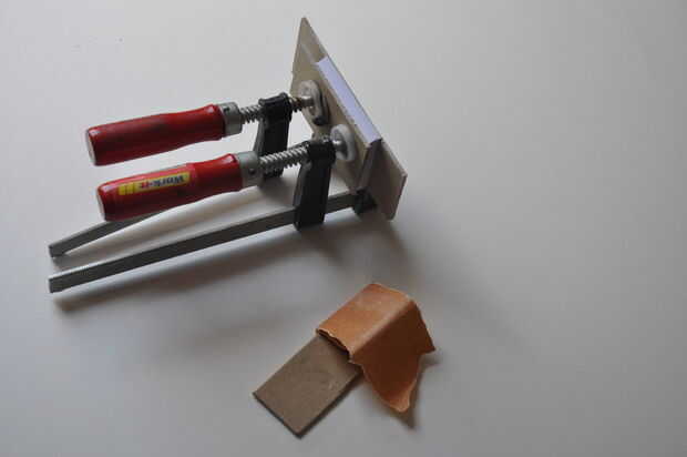 Para eliminar el borde oblicuo del libro fije todo entre las abrazaderas y lijado comenzó. Esto funciona